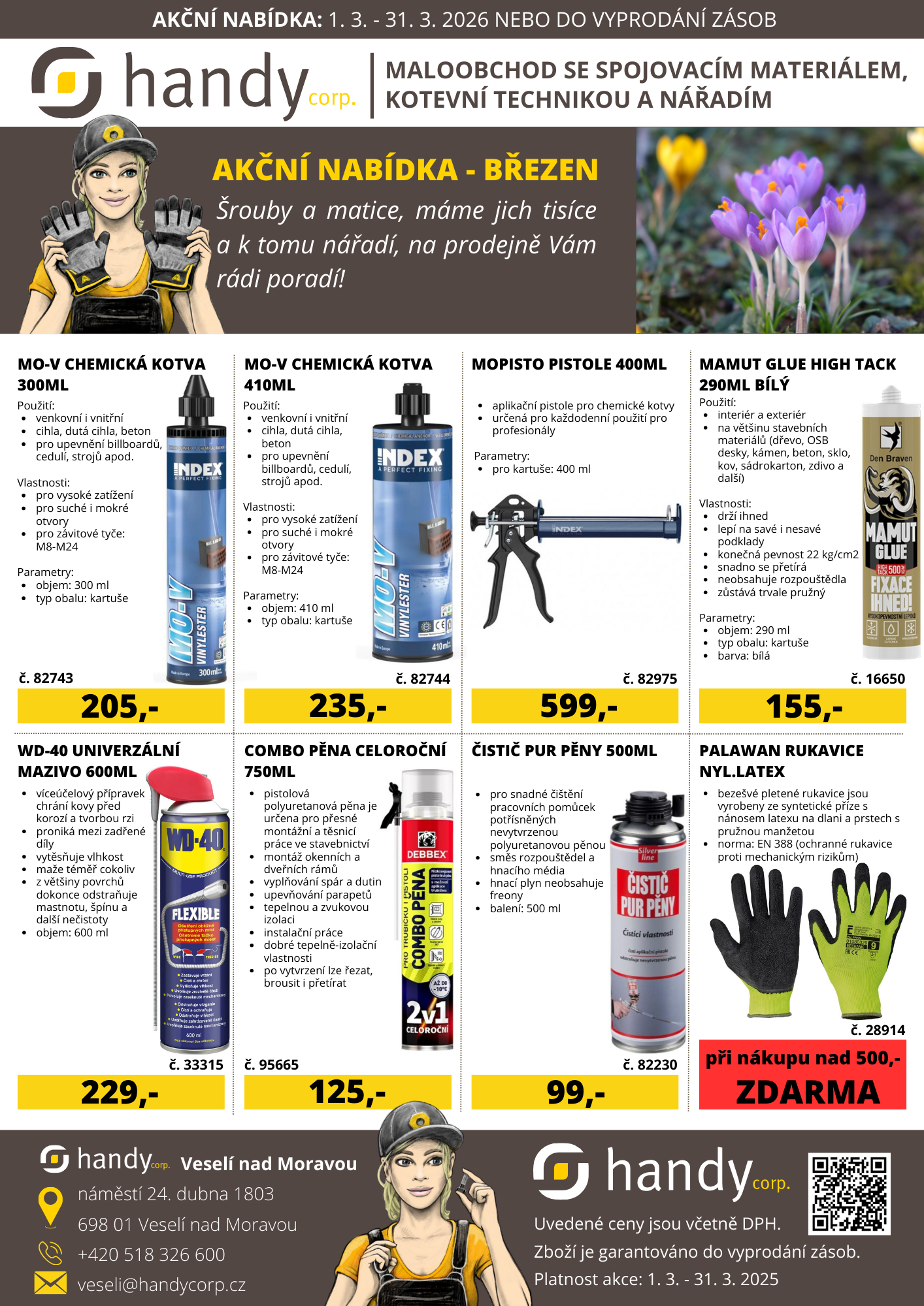 Víte co je ještě lepší než to, že se prodlužují dny☀️? Jsou to rukavice 🧤 ZDARMA při nákupu nad 500 kč, který obsahuje alespoň jednu položku z letáku. Nepromeškejte příznivé ceny. Máme pro Vás nejen chemické kotvy⚓, PU pěny, wd-čka, ale mnohem víc zajímavého sortimentu.