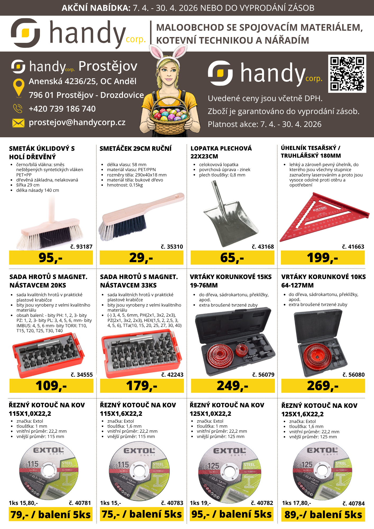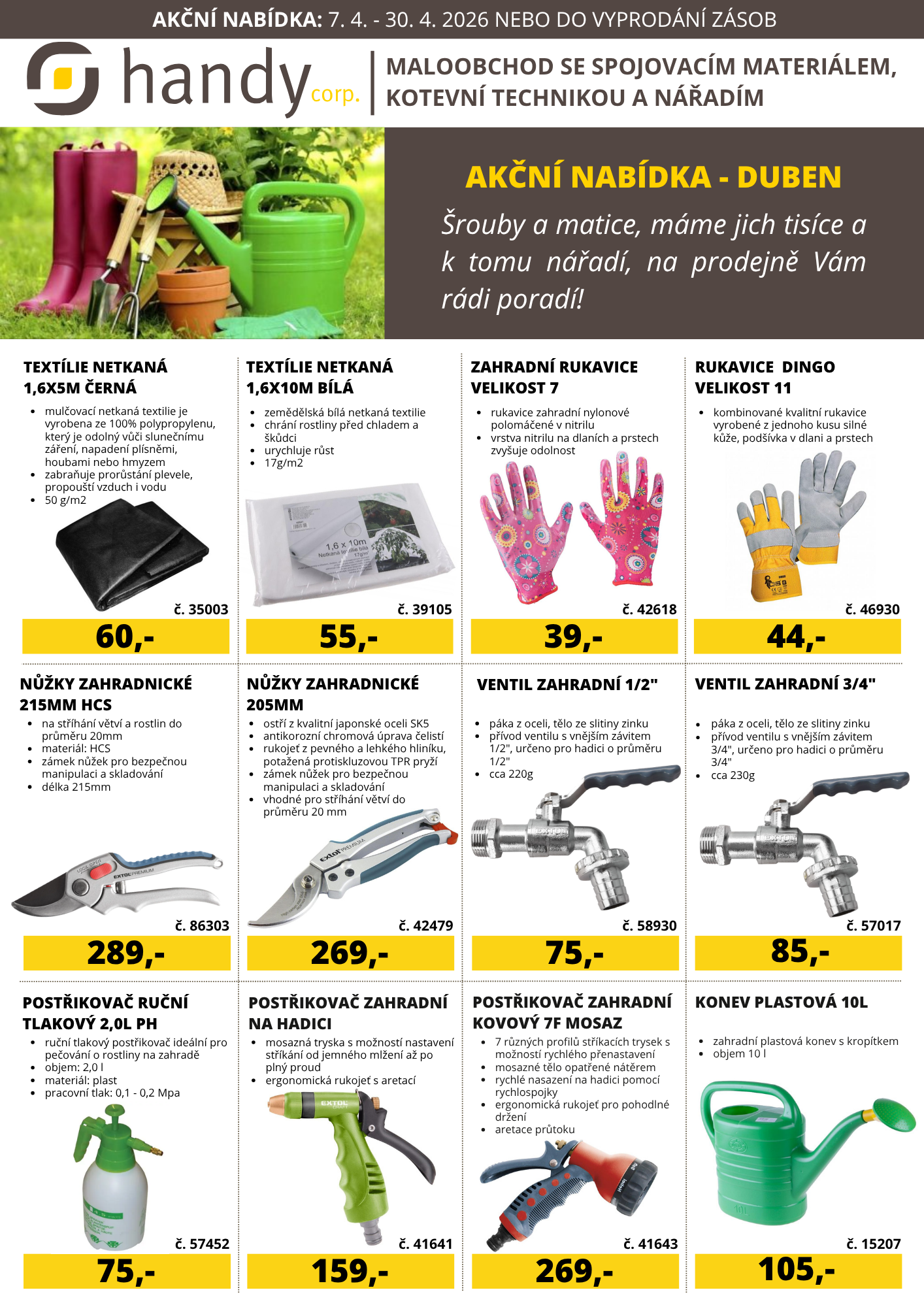 "Březen – za kamna vlezem, duben – ještě tam (ne)budem" - protože spěcháme na prodejnu handy corp. Prostějov. Tam Vás potěší akční nabídka, která Vám usnadní každodenní práci. Využijte výhodné ceny na zahradní nůžky, konve, netkané textilie i pracovní rukavice 🌿🧤. Pro kutily nechybí ani sady hrotů, vrtáky nebo řezné kotouče a další sortiment za výhodné ceny.