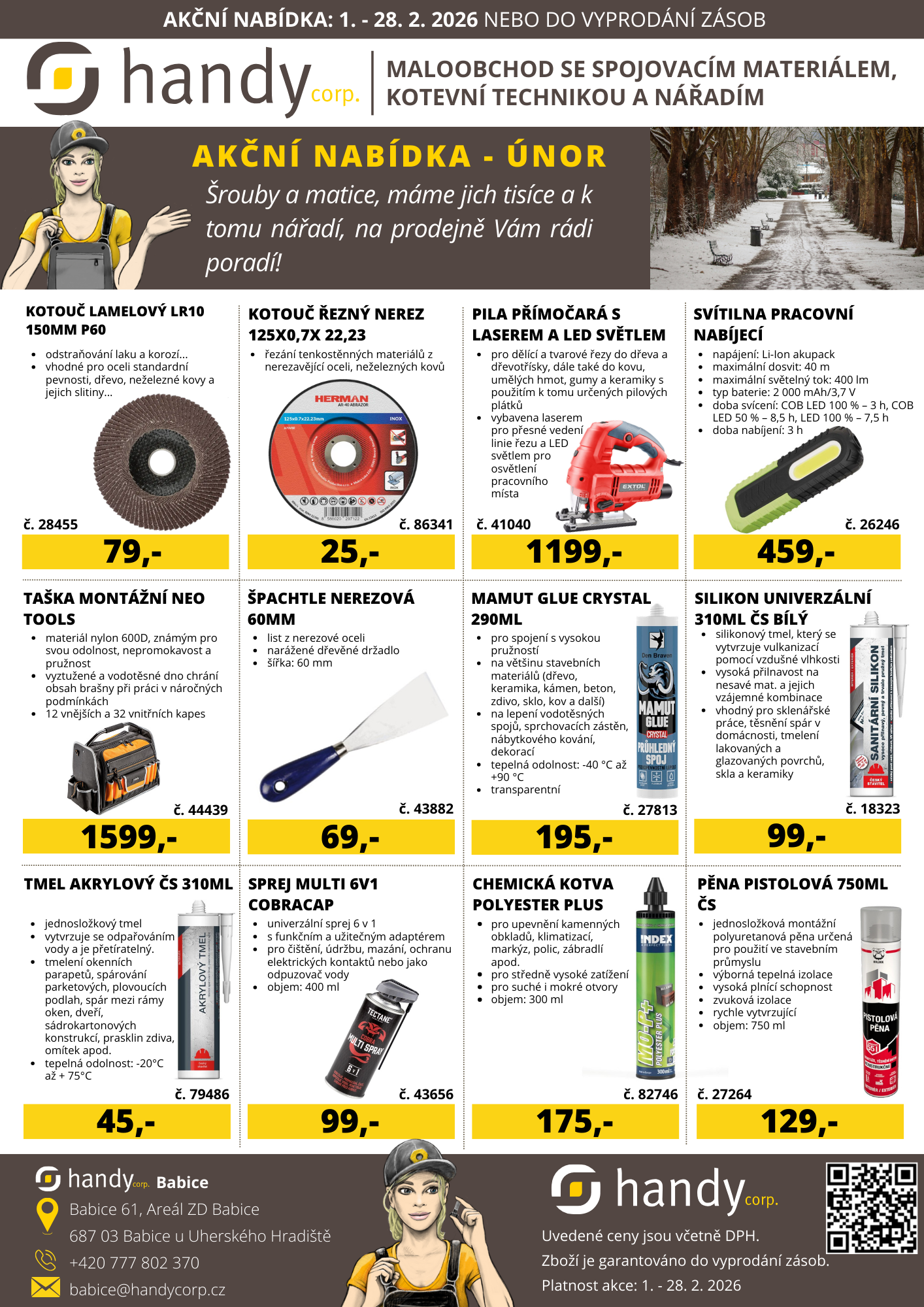 Na prodejně handy corp. Babice to právě teď řeže, lepí, pění a svítí 🔦 – zastavte se například pro řezný kotouč, přímočarou pilu, svítilnu nebo pro další sortiment za výhodné ceny.